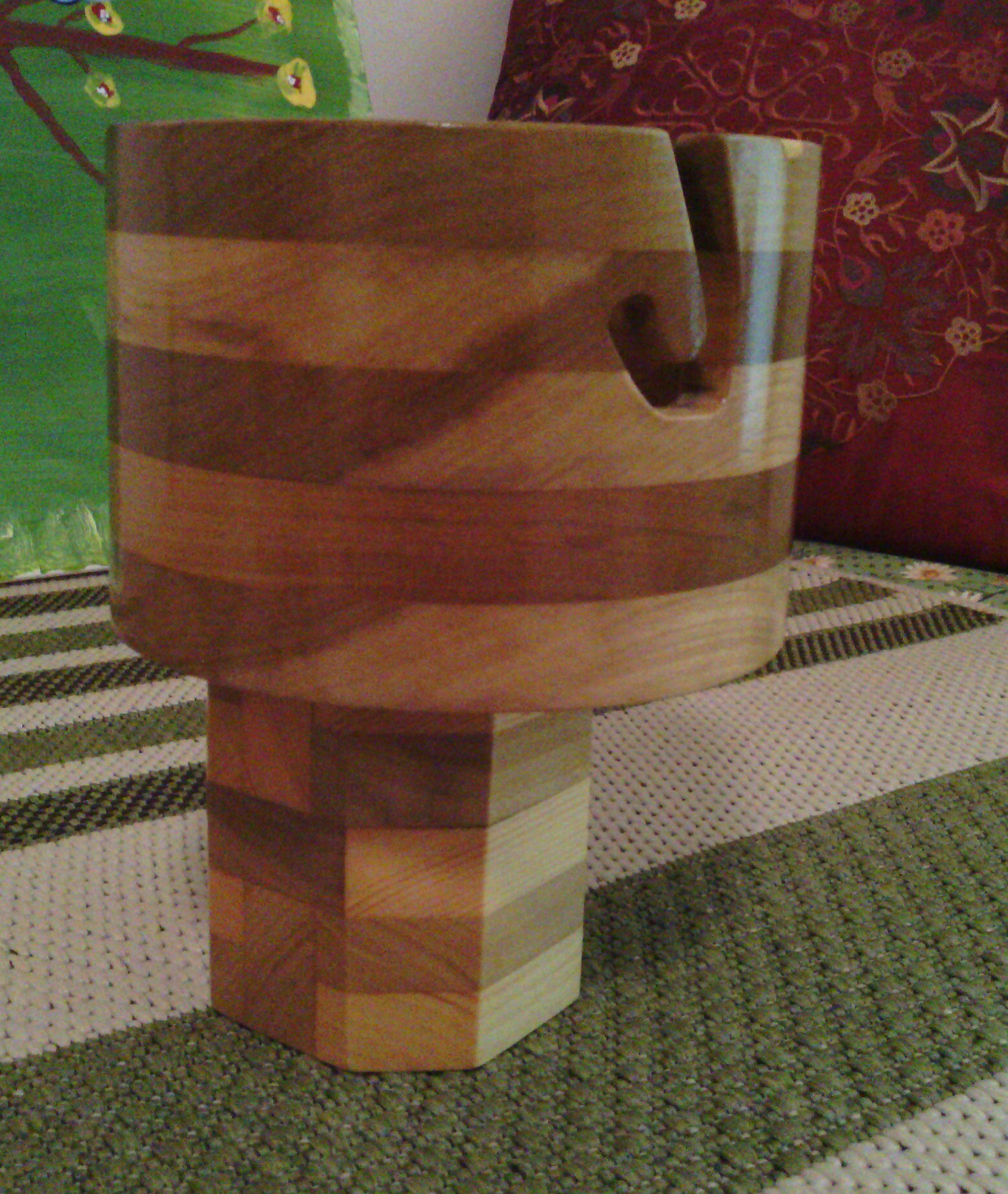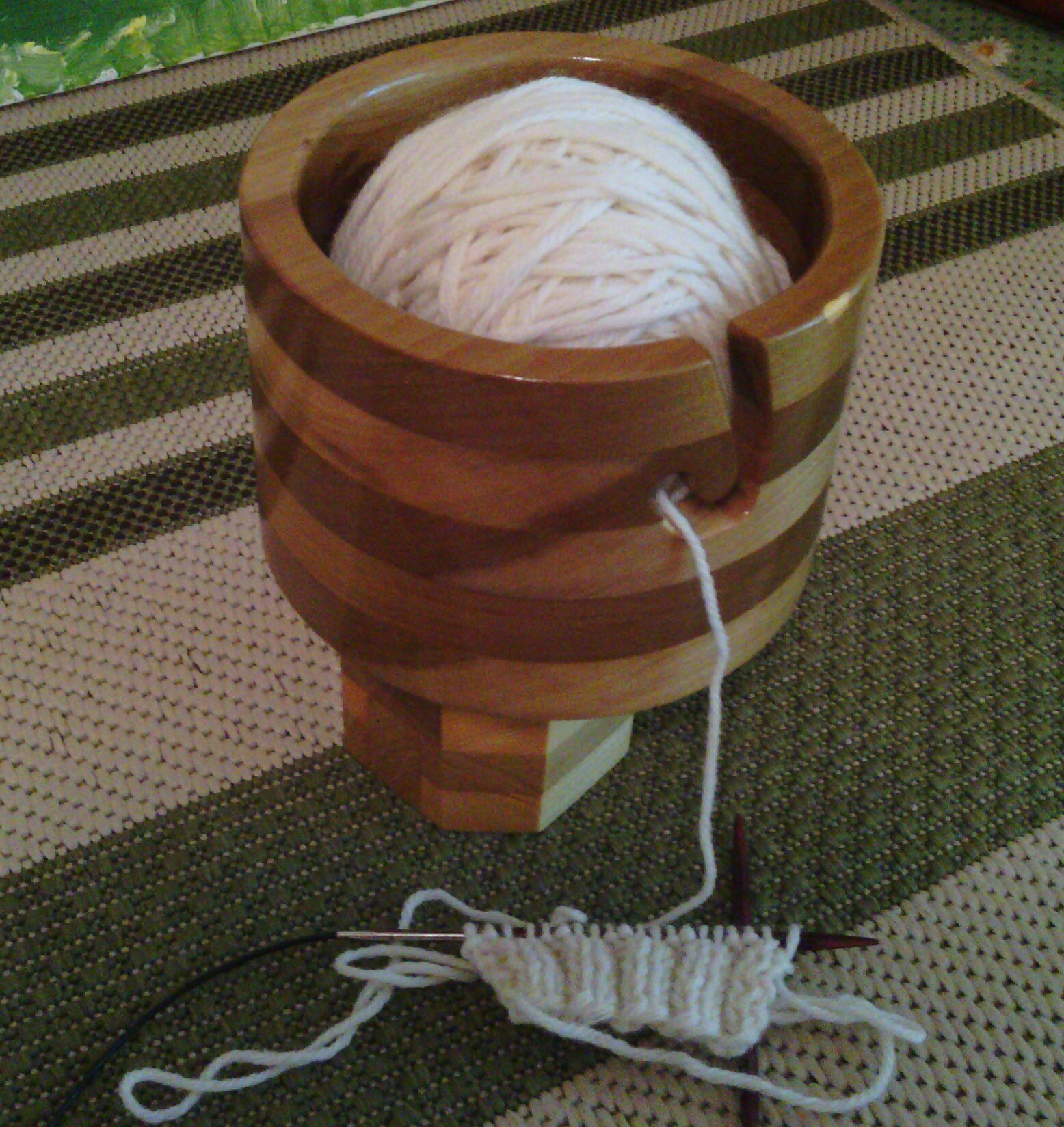 A yarn bowl that travels. It looks like a nice home loving yarn bowl until you attach it to the stand.