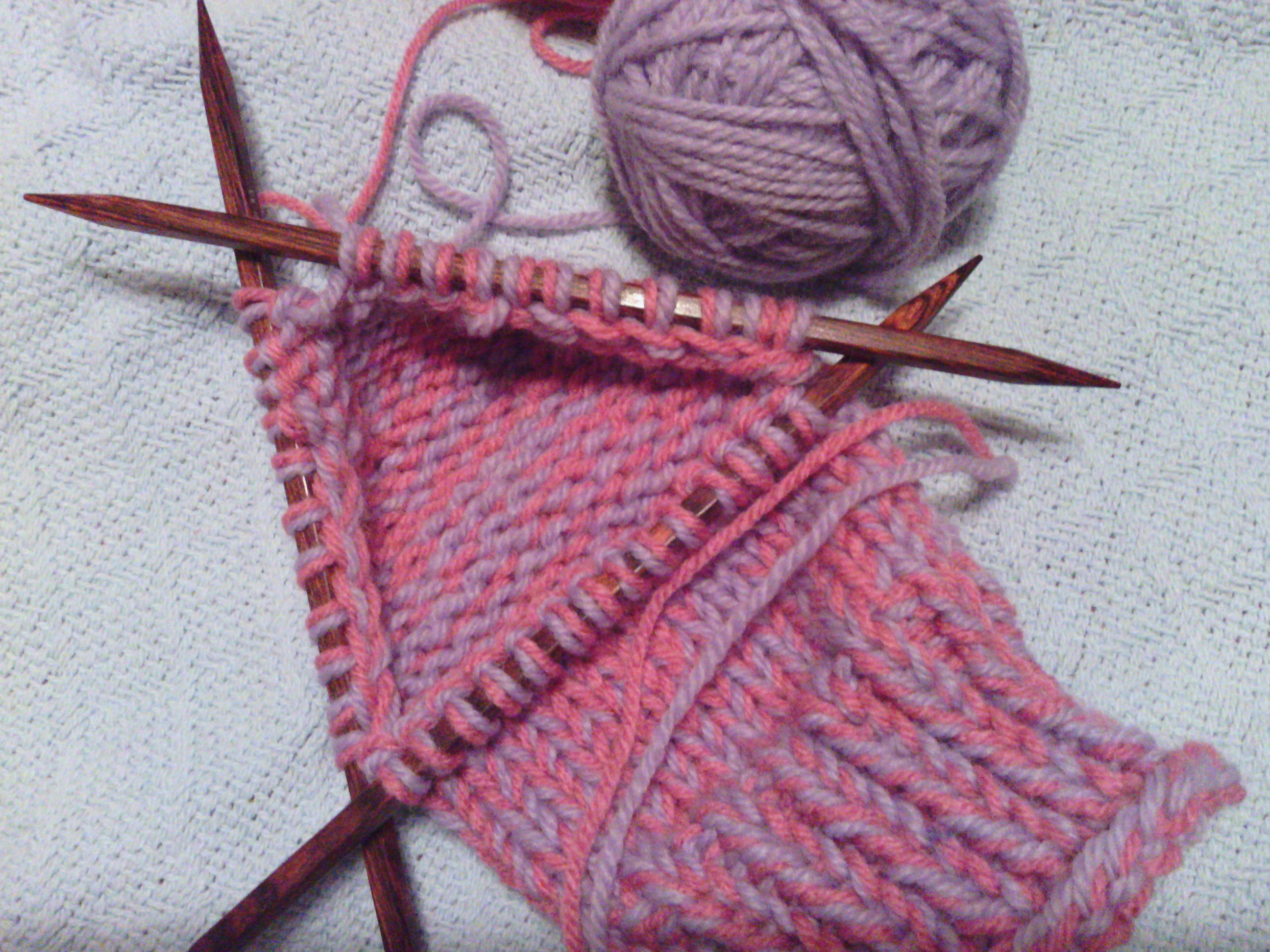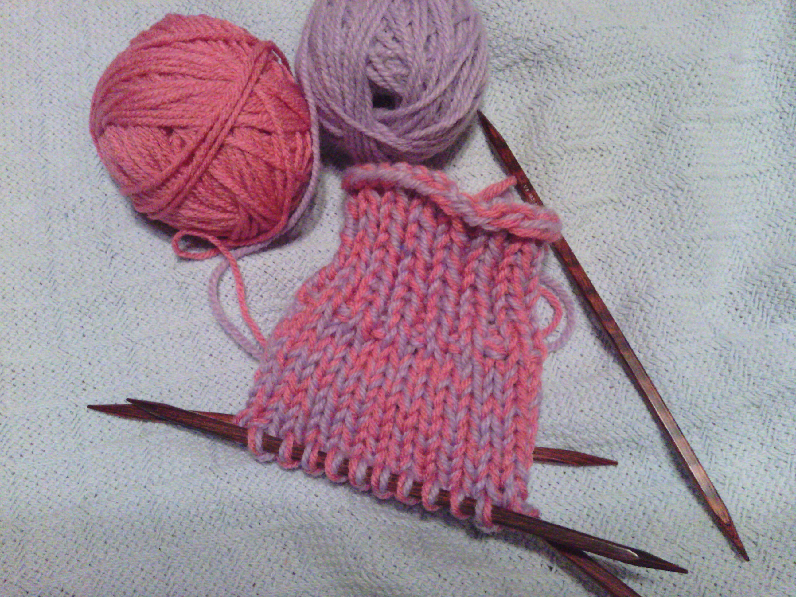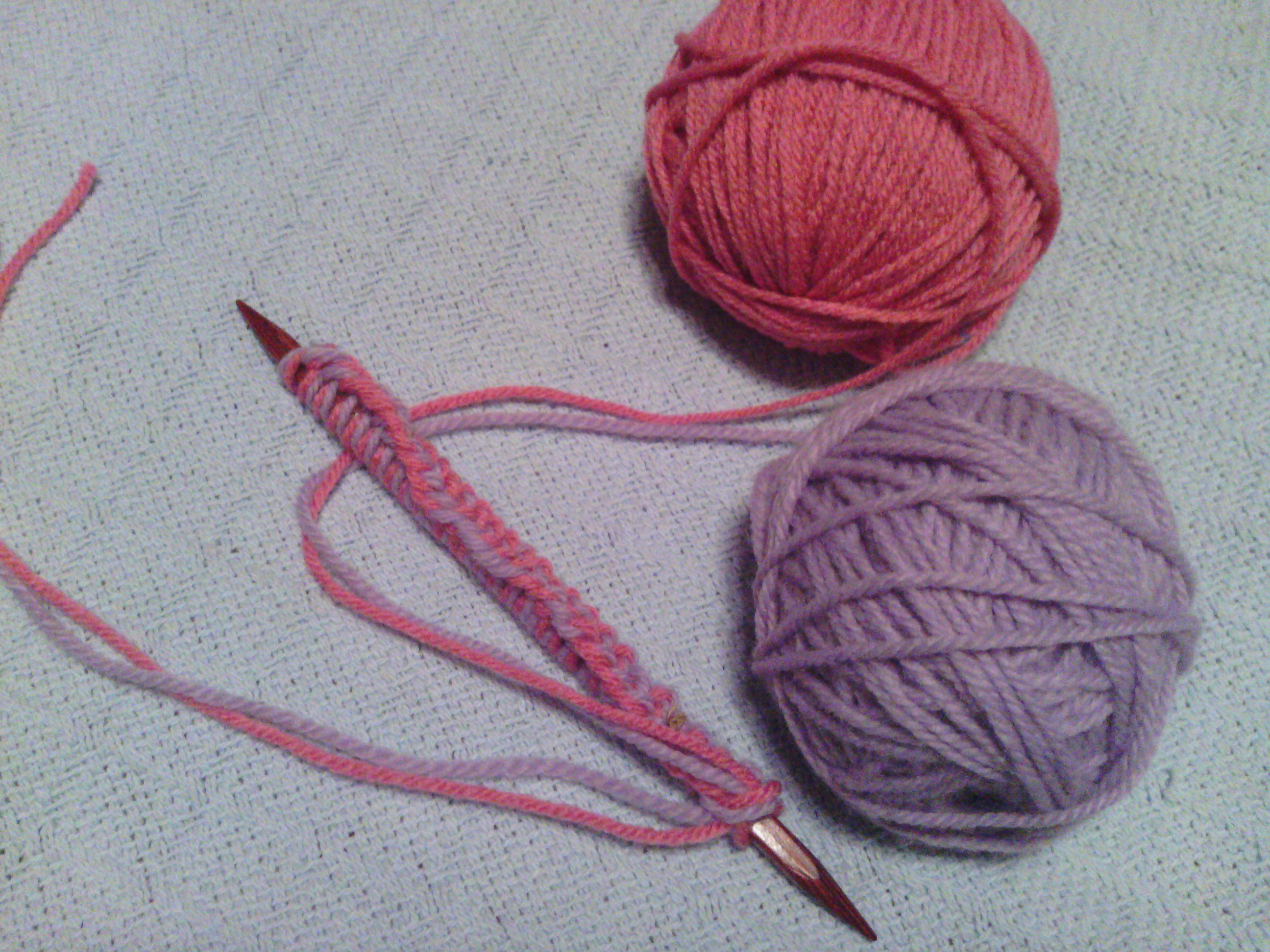 Using two balls of worsted weight yarn from your stash (I am using Plymouth Encore) and size 10.5 doublepoint needles: