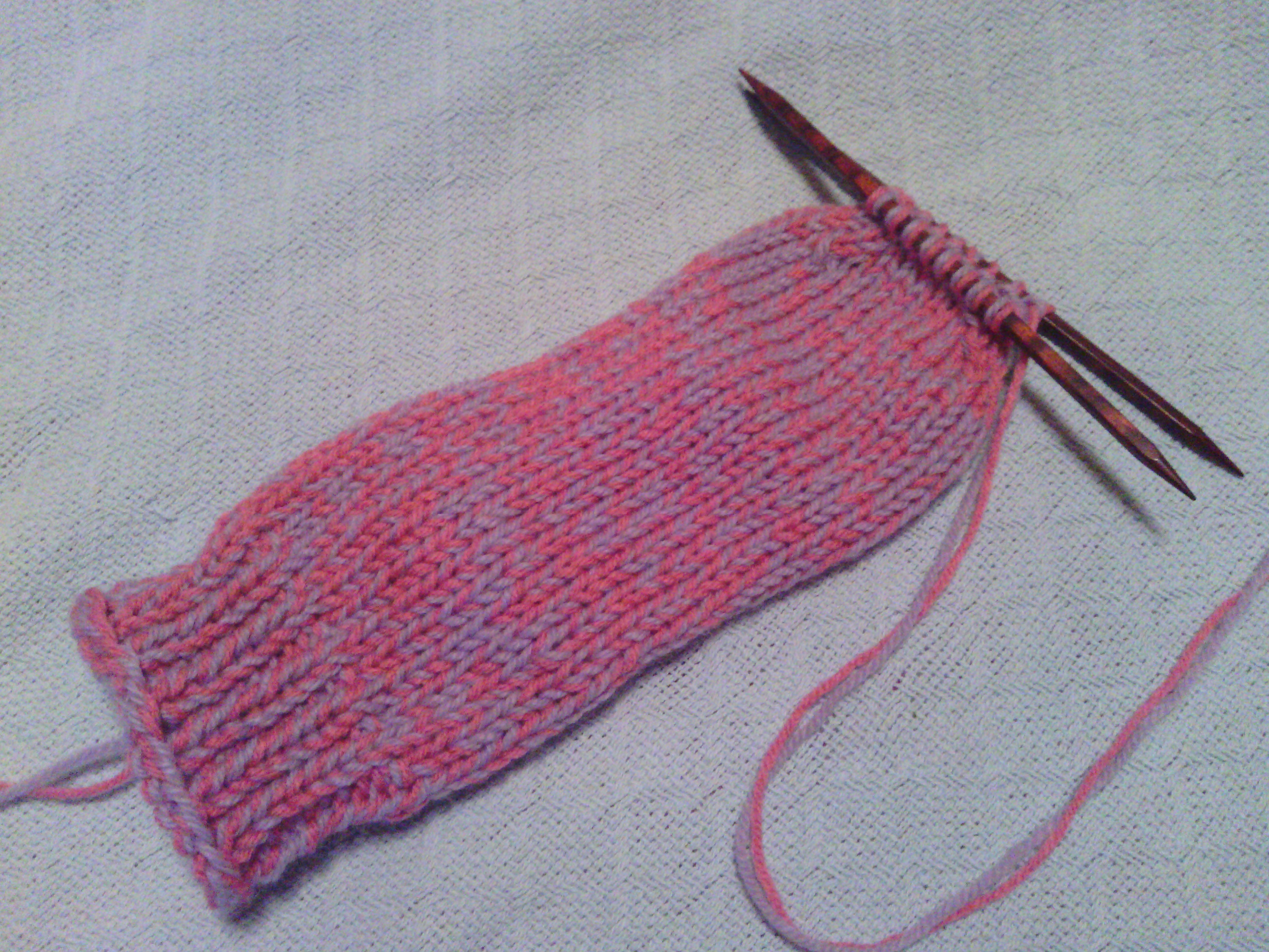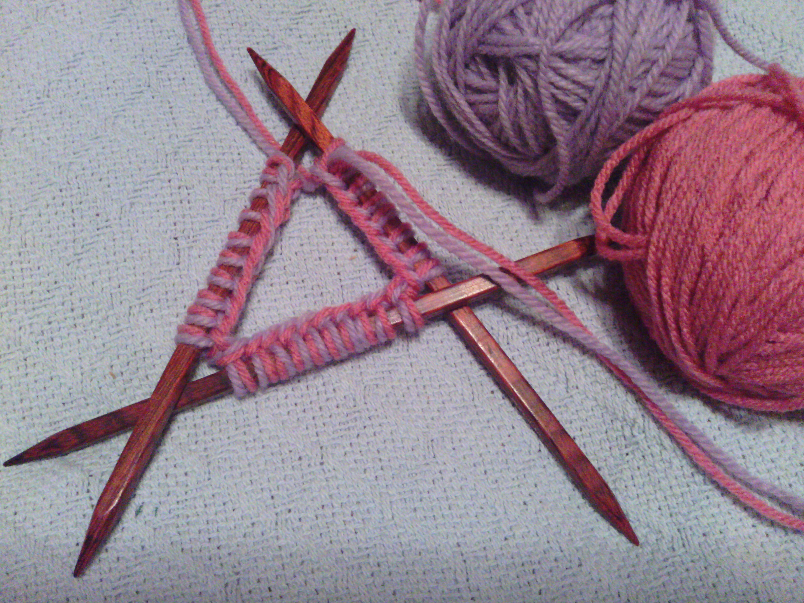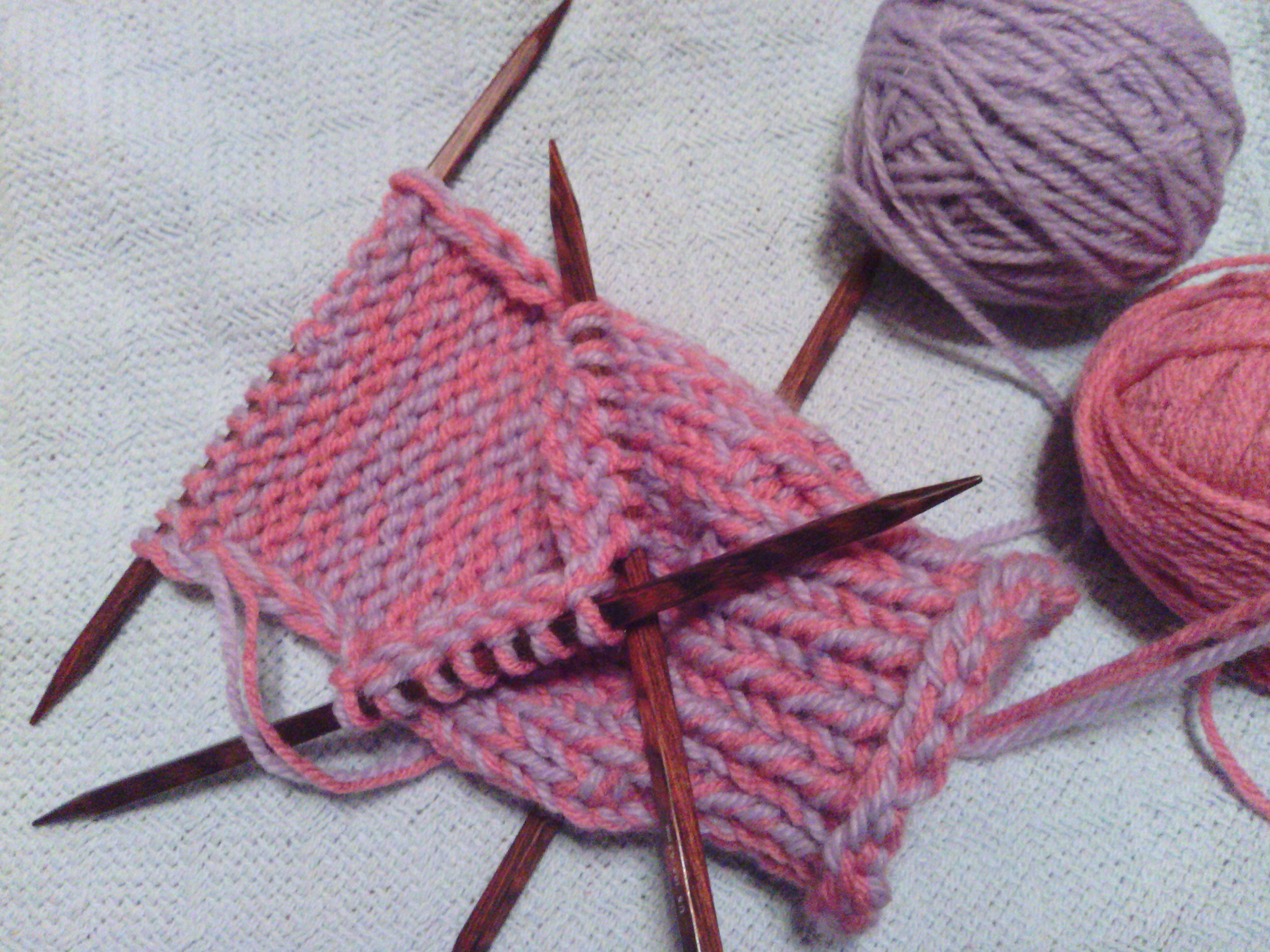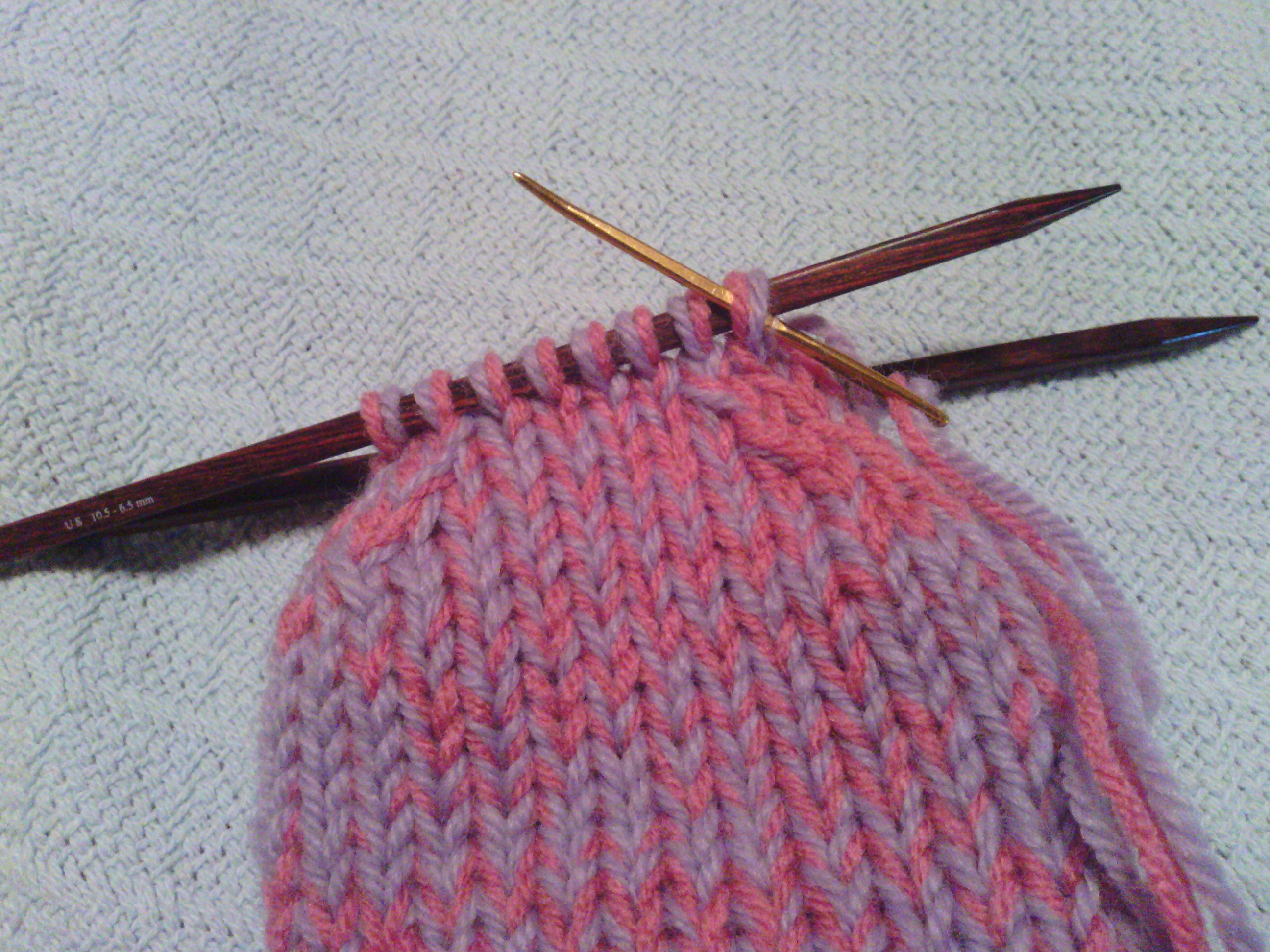 10 stitches on needle 1, 10 stitches on needle 2, 8 stitches on needle 3. Join and knit one round.