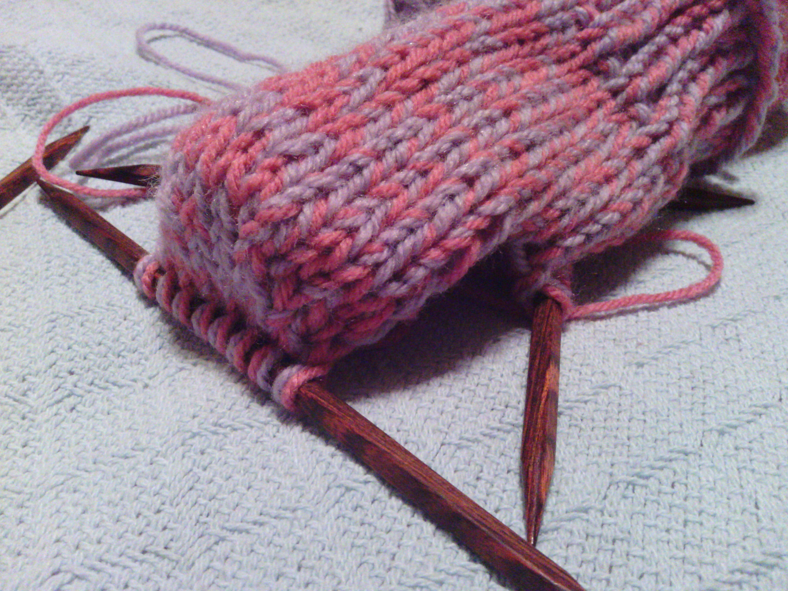 Knit 1, purl 1 around for 10 rounds. This will be the ribbing. Then knit every round for 10 rounds.
