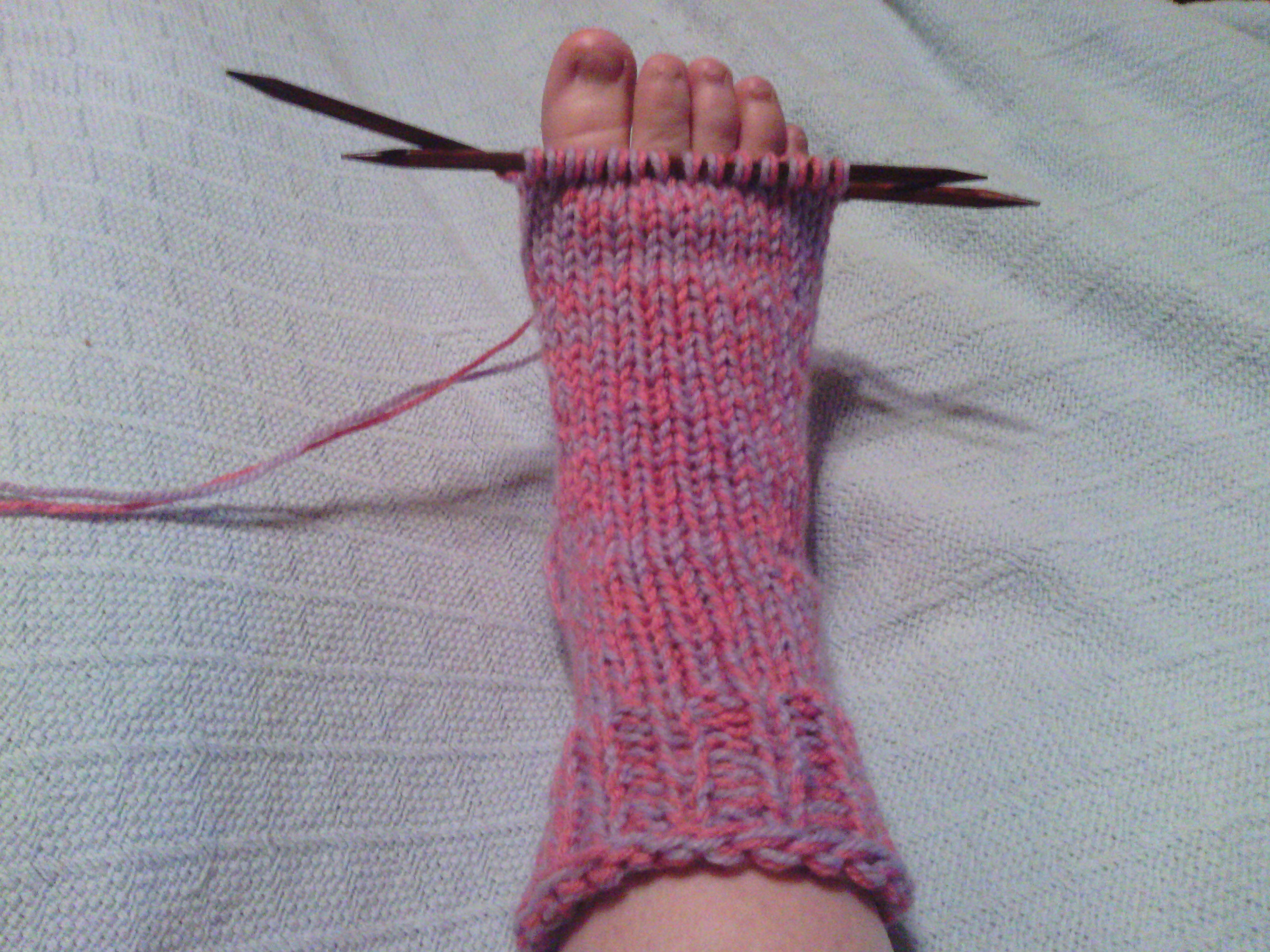 Continue to knit every round until sole of foot measures 2″ less than the desired length of finished sock ( measured from base of heel flap). This is a good time to try on your sock so you can be sure it will be the perfect length.